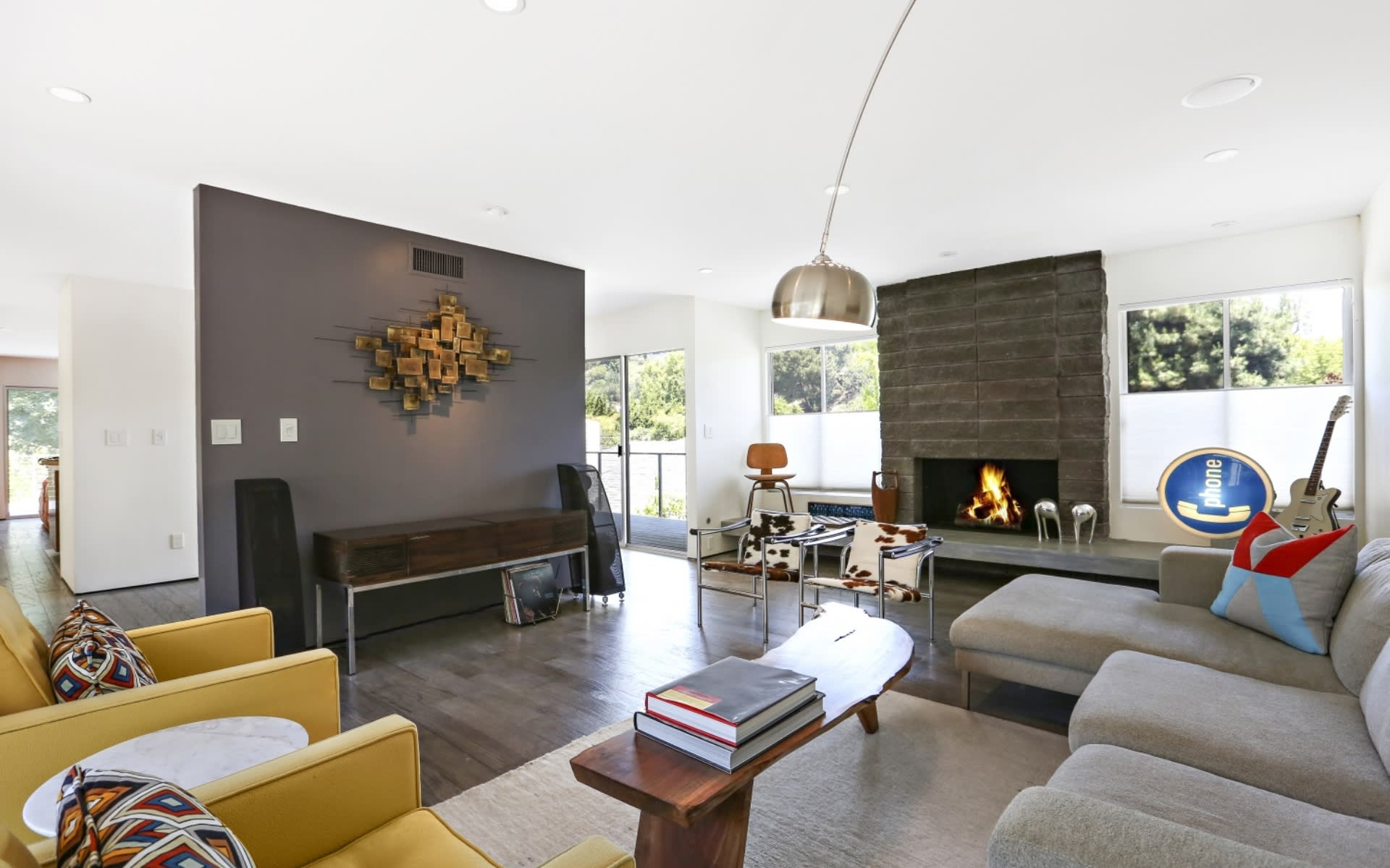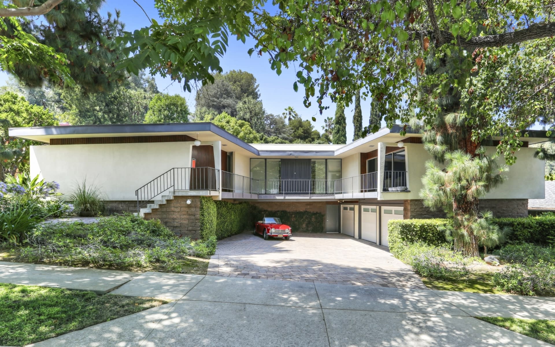 Near the end of a quiet cul-de-sac, this Mid-Century Modern gem in the Altos de Monterey area of South Pasadena is sited on a large flat lot with sprawling gardens and mature fruit trees. Reimagined in 2009 by noted architecture firm, Chu + Gooding, the home has undergone an extensive while maintaining its mid-century roots. With two proportional wings, the trapezoidal structure maintains a clear distinction between the living areas and bedrooms. Walls of glass on all sides grant easy access to the exterior from many rooms. An incredible attention to detail has been paid to all aspects of this home: floating, gallery style walls, poured concrete fireplace deck, gorgeous wood paneling, high-end appliances in the kitchen and speakers in virtually every room. This is a very unique home, oozing style refinement. Very close to the coveted Monterey Hills Elementary School.